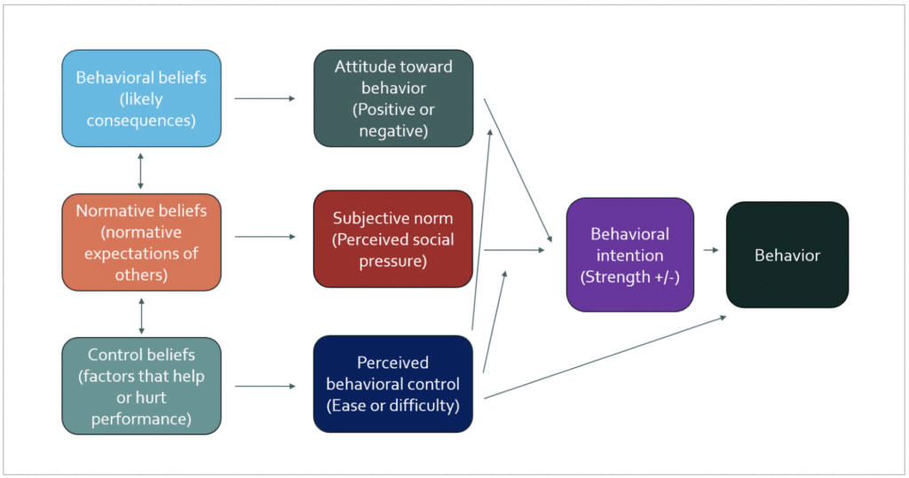 An individual’s attitude and perceived social pressure contribute to the strength of one’s intention to follow through with the behavior or not. The stronger the intention, the greater the likelihood of following through with the behavior.